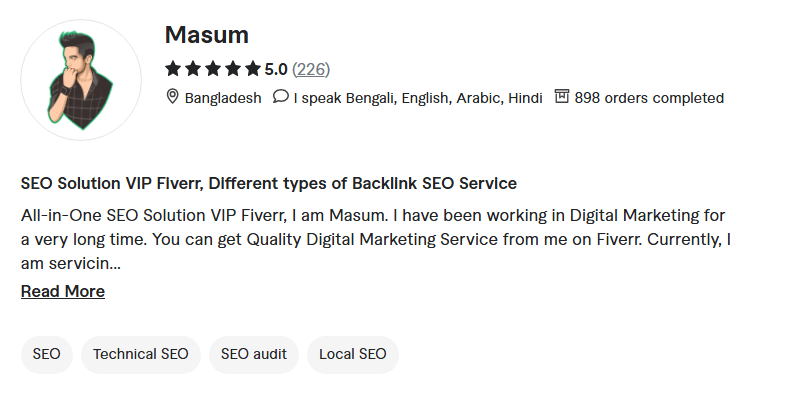 Whether it’s optimizing your site’s structure, building high-quality backlinks, or performing detailed keyword analysis, Masum approaches every project with passion and precision — making him one of the most trusted SEO specialists on Fiverr.
